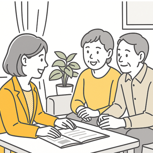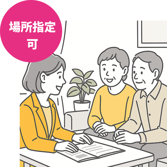 ご自宅の他、喫茶店などご指定の場所にスタッフが伺い、資料を見ながらじっくり相談が可能です。事前にお電話でご予約ください。