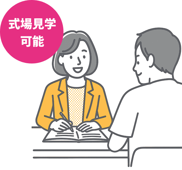 京王メモリアルの自社ホールにご来館いただき、資料をみながらじっくり相談が可能です。当日実際の式場を見学することも可能です。事前にご予約をいただくとスムーズです。