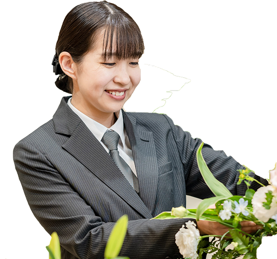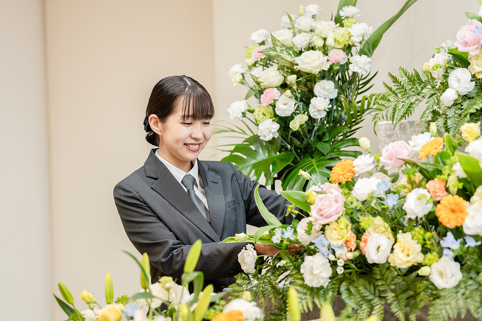 現在は、来館されるお客様の対応や打ち合わせ、ご葬儀の事前相談、式場の準備や清掃、ご葬儀の担当、葬儀後の精算書の作成など、お式だけでなく幅広く様々な業務に携わっています。最近では新入社員の研修担当として新人職員の育成に励んでおり、成長する姿にやりがいを感じています。