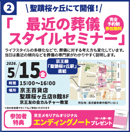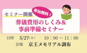 本日は、5月15日(金)に京王百貨店聖蹟桜ヶ丘店B館にて開催いたします「最近の葬儀スタイルセミナー」についてご案内します!